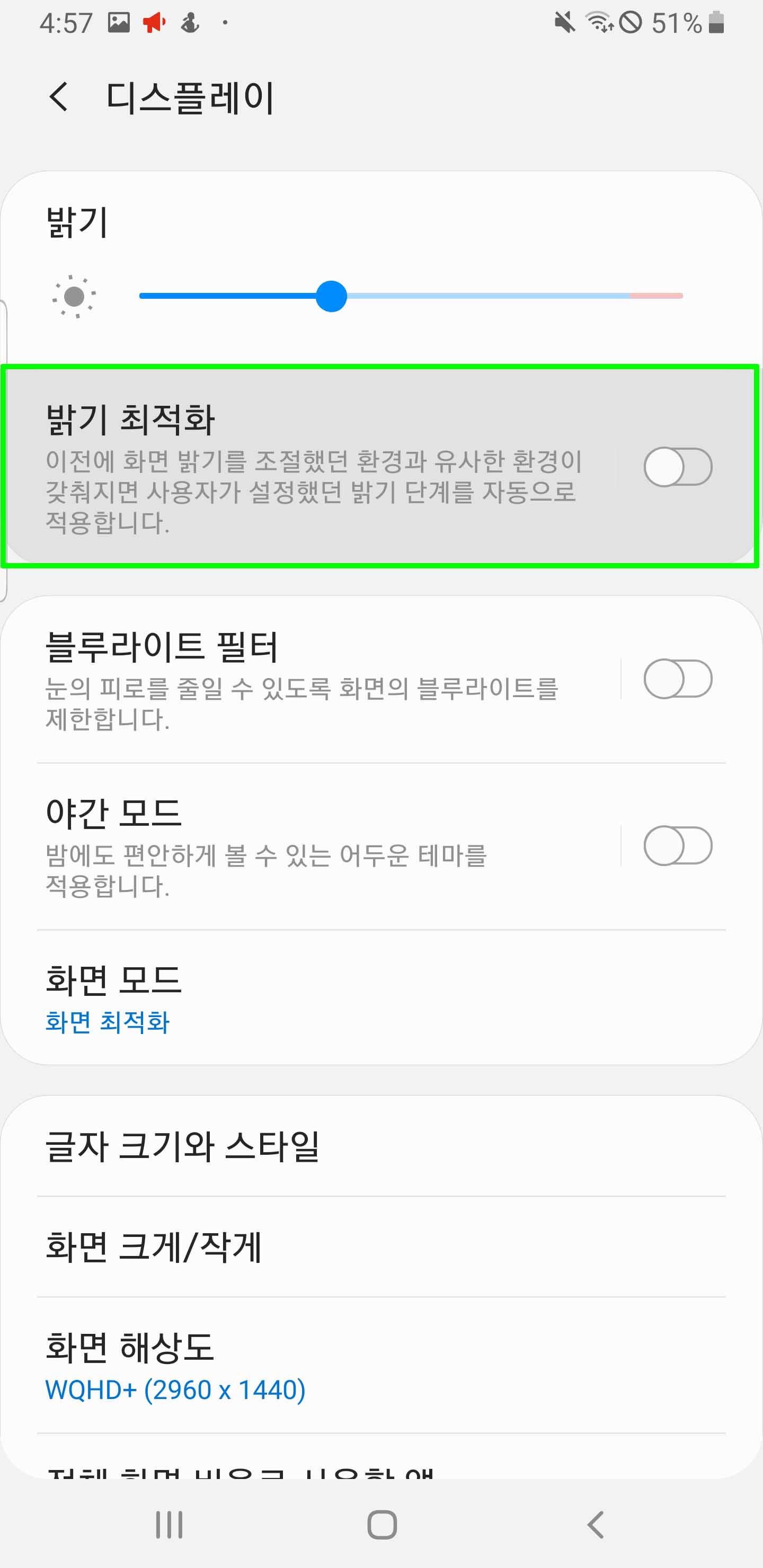 [Android] 안드로이드 디스플레이 화면 밝기 최적화 자동 변경 방법 설정 바꾸기 주변 밝기 변화 끄기 켜기 갤럭시s21 20 갤럭시노트 21 20+